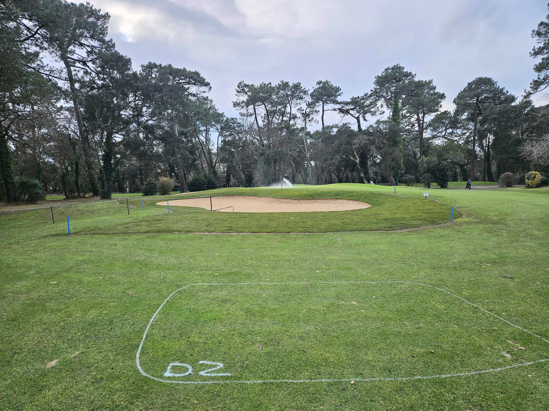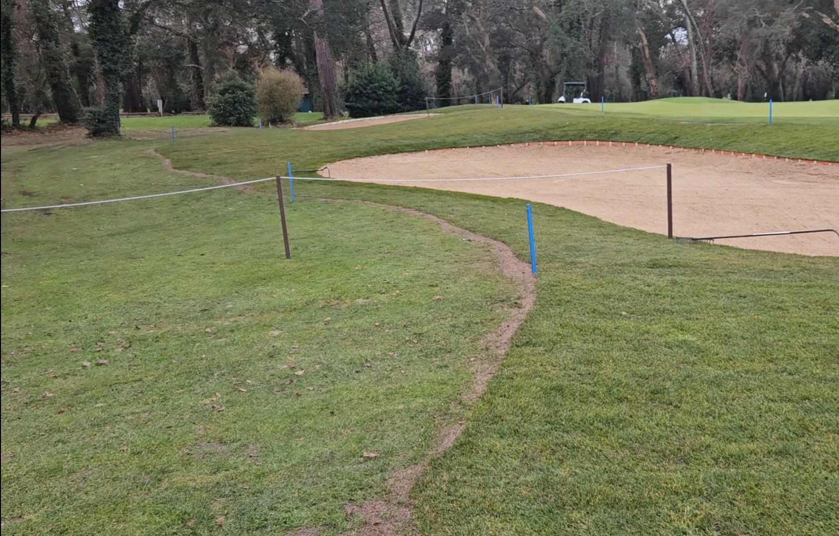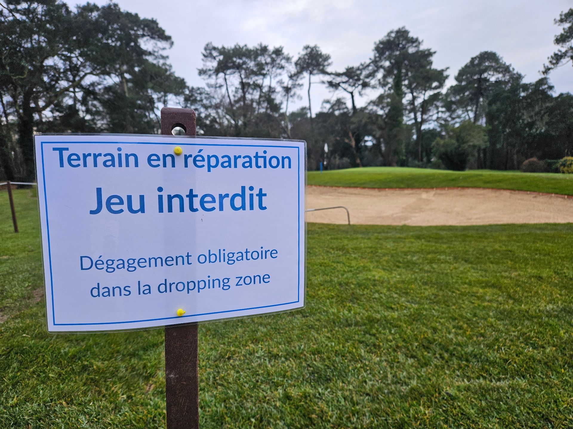 La zone de travaux est délimitée par des piquets bleus, c'est un terrain en réparation (bunkers compris) d'où le jeu est interdit. Si votre balle y repose , la zone de dégagement obligatoire est la dropping zone tracée sur le fairway, devant le bunker de gauche.