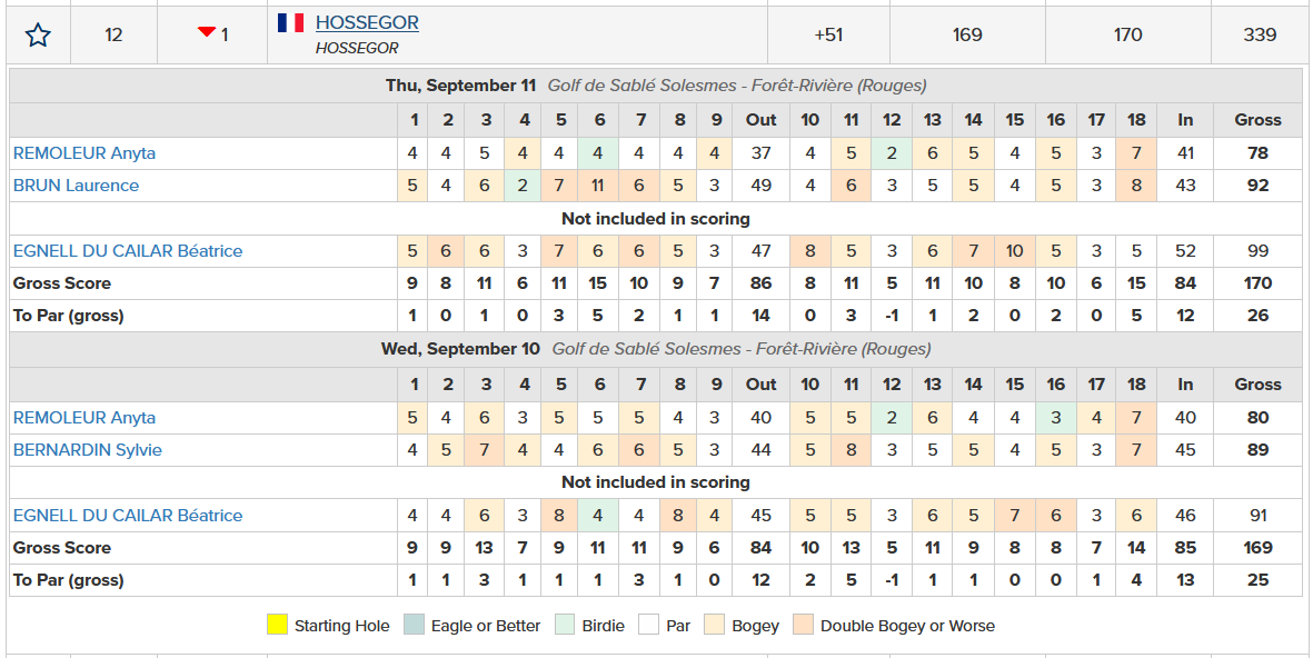 Sportif Liste des actualités Le 16 septembre 2025 Championnat de France séniors 2 dames Notre équipe disputait le championnat de France, du 10 au 14 septembre, sur le golf de Sablé-Solesmes. Dans ce format XXL qui rassemblait 35 équipes, nos rouge et bleu terminent à la 12ème place. Résultats Béatrice Egnell, Sylvie Bernardin, Anyta Rémoleur, Laurence Brun et Sabine Lauga