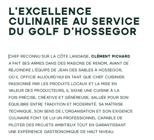 En date du 13 octobre dernier, le comité a acté la décision unanime de ses membres de choisir l’équipe composée par Clément Pichard et Félicien Declercq pour prendre en charge la subdélégation du Club House avec l’ambition d’offrir une restauration adaptée aux golfeurs, avant ou après leurs parties, ainsi qu’aux membres ou visiteurs souhaitant prendre le temps de se restaurer dans le beau cadre de notre Club-House.