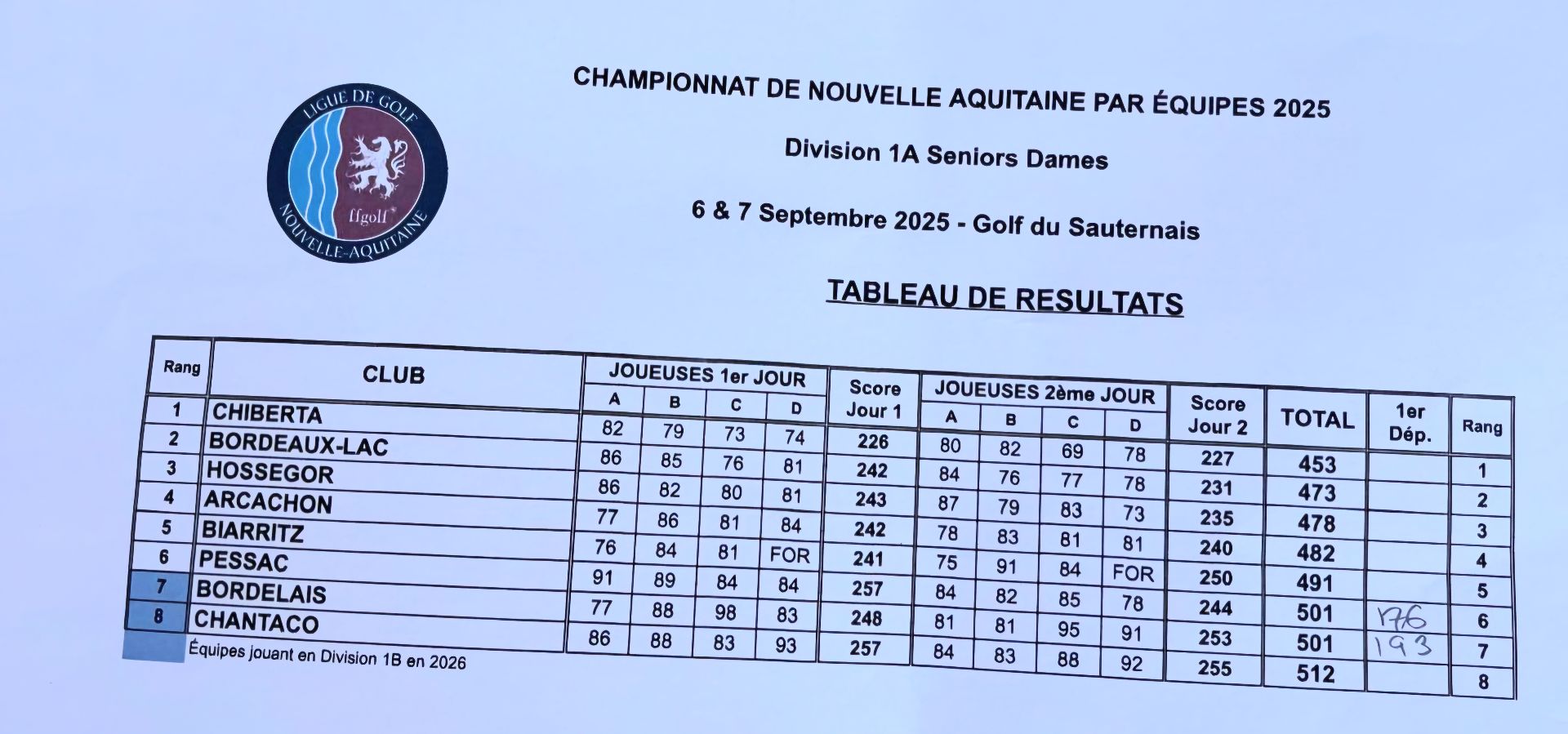 Sportif Liste des actualités Le 7 septembre 2025 Championnat régional séniors dames division 1A L'équipe séniors dames dispute, ce week-end, le championnat régional au golf des Graves et Sauternais. Bravo à nos séniors dames qui réalisent une belle 2ème journée pour accrocher un podium bien mérité. en route vers le championnat de France... Infos et résultats